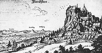 ![]() Burg und Ort Parkstein um 1630, Kupferstich von Matthäus Merian | ||