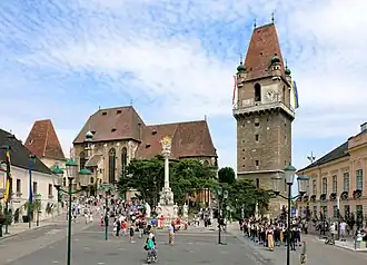 Der Turm rechts weist einen auskragenden Wehrgang auf, im Zentrum die Pfarrkirche | ||