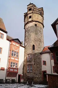 Der 32 Meter[21] hohe Bergfried hat einen runden Grundriss mit einem Durchmesser von etwas mehr als acht Metern. Sein bis zum Helm einheitliches Mauerwerk gehört wahrscheinlich der frühesten Bauphase an. Im dünneren Mauerwerk des geräumigen Saales im vierten Stock zeigen die Reste einer in die Mauer eingelassenen Treppe, dass dieser bereits zum Renaissancehelm gehört. Der ursprüngliche Eingang ist an der Hofseite im dritten Stock auf etwa zehn Metern Höhe als spitzbogige Pforte zu erkennen. Die beiden darunterliegenden Geschosse dienten als Verlies und waren nur von oben über ein Angstloch im Gewölbe zugänglich. Die heutigen Fenster wurden 1581 eingebaut. Man durchbrach die Wand zu deren Einbau, als man auch diese Geschosse zu Wohnzwecken nutzen wollte. Ein neuer seitlicher Zugang war bereits im 15. Jahrhundert durch einen angebauten Treppenturm mit Wendeltreppe entstanden. Die 57-stufige Wendeltreppe innerhalb des Bergfriedes beginnt deshalb erst im dritten Stock und setzt über einem dreiarmigen Bogen an, da man das ehemalige Loch zum Verlies anscheinend noch nicht zubauen wollte.[22]