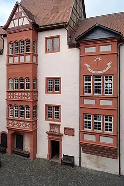 Der stattliche viergeschossige Bau ist 32,5 Meter lang und nicht ganz neun Meter breit. Die hofseitige Fassade wird durch zwei hohe Erker gegliedert, von denen einer als Standerker ausgeführt ist. Am linken Erker sind in den beiden Hauptgeschossen das Blendmaßwerk und im Untergeschoss die Wappen der Bauherren auffällig. Am rechten Erker befinden sich Spiegelquader, die sorgfältig mit schachbrettartigem Muster verziert sind. Sie stellen ein herausragendes Beispiel renaissancezeitlicher Steinmetzkunst dar. Aufgrund des Brandes von 1621 ist das oberste Geschoss des Erkers, das heute eine Sonnenuhr trägt, nicht original. Zwischen beiden Erkern befindet sich das Portal mit dem Wappen von Ysenburg und von Gleichen, daneben der Grundstein mit Inschrift aus dem Jahr 1573.[26]