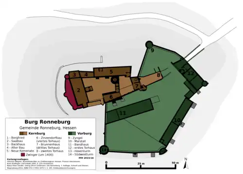 Die rechteckige Kernburg mit ihrer kräftigen Wehrmauer hebt sich im Grundriss der Ronneburg deutlich hervor. Sie ist mit dem Bergfried und dem Saalbau der älteste Bauteil aus dem zweiten Viertel des 14. Jahrhunderts. Die ausgedehnte Vorburg im Süden und Osten der Anlage entstammt einer späteren Bauphase aus den Jahren 1538–1550.[7]