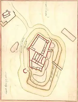 Außerdem wurde um die nördliche und östliche Seite der Burg eine vorgelagerte, kleinere Verteidigungsmauer errichtet, die im Norden einen Zwinger bildete. Eine unkonventionelle Lösung war der Hauptzugang zur Burg, der zunächst über eine Brücke führte und dann unterirdisch unter dem äußeren östlichen Mauerring verlief.[10] Auch außerhalb der Burganlage wurden im Süden, Osten und Norden weitere Verteidigungswälle und Wassergräben errichtet, die zum Teil auch heute noch zu erkennen sind.