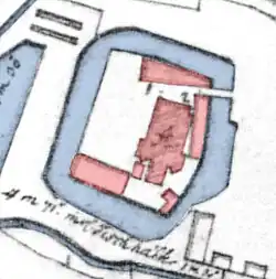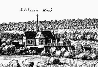 ![]() Burggelände mit St.-Johannis-Kirche um 1650, Kupferstich von Merian (Ausschnitt) | ||