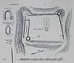 Der Grundriss der Anlage bildet ein unregelmäßiges Trapez mit den Abmessungen 56 × 42 Meter bzw. 47 × 37 Meter.