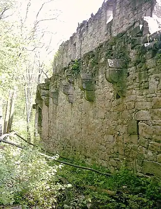 Das Burgplateau wird im Osten durch einen tiefen, etwa 15 Meter breiten Halsgraben vom Hinterland abgetrennt. Auf dieser Seite haben sich nur wenige Mauerreste im Anschluss an den südöstlichen Flankierungsturm erhalten. Der nordöstliche Eckturm ist, bis auf vor kurzem freigelegte Sockelreste, verschwunden, die anschließende Kurtine noch bis zum Ansatz des Wehrganges erhalten.