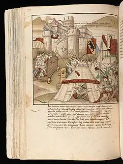 - Zerstörung der Burg Schwanau bei Strassburg am Rhein, Spiezer Chronik von Diebold Schilling dem Älteren, 1484/85.