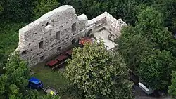Am Südrand des Plateaus steht ein aus Bruchsteinen errichteter Mauerrest der Burg mit Fenster- und Tordurchbrüchen. Weiter nördlich führt eine verschlossene Tür zu einem rekonstruierten ehemaligen Kellerraum der Burg, der als Veranstaltungsraum genutzt wird. Dessen Entlüftungsschacht ist als Brunnenimitation gestaltet.