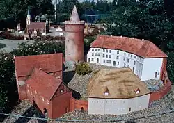 Modell der Burg Stargard. Das Krumme Haus (in weiß) ist heute nur noch als Ruine erhalten.