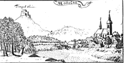 Städtchen Mohelno und Burg Tempelstein (überhöhte Darstellung, Mitte des 18. Jahrhunderts)