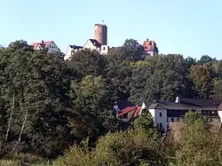 Aus dem 13. Jahrhundert stammt der gut erhaltene, 27 Meter hohe runde Bergfried aus Buckelquadermauerwerk mit quadratischem Innenraum. Das noch gut erhaltene Pflegamtsgebäude aus neuerer Zeit, über dessen Eingang ein Drachenrelief zu sehen ist, steht an der Südseite.