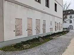 Das Lapidarium befindet sich an der Nordwand des Westflügels des Burggebäudes und an der Westseite der Umfassungsmauer des Burggartens. Einzelne Beispiele sind in der Sammlung (Raum II), bzw. in den Vorräumen der Sammlung und im Stiegenhaus untergebracht. Die Grabsteine, die teilweise nur in Fragmenten erhalten sind, reichen vom 15. bis zum 19. Jahrhundert. Die Grabsteine und Denkmäler stammen zum Teil von der Stadtpfarrkirche und dem ersten Pfarrfriedhof aus der unmittelbaren Umgebung der Kirche. Teilweise wurden sie von dem um 1570 angelegten und bis 1888 in Verwendung stehenden Friedhof am heutigen Marktplatz übertragen. Auch sind Grabsteine aus der Minoriten-Kirche gesammelt worden.[6]