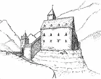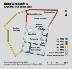 ![]() Rekonstruktionsversuch der Burganlage Werdenfels um 1600 (Ansicht vom Süden)[1] | ||