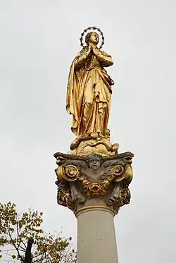 Am Burgauer Hauptplatz befindet sich auf einem quadratischen Sockel eine ca. elf Meter hohe Mariensäule. Sie wurde 1750 errichtet und an der Spitze befindet sich eine vergoldete Marienfigur aus der Veit Königer Werkstatt, die nach Osten blickt; zur Erinnerung, aus welcher Richtung die Pest in den Ort kam. Ein Stich des Topographen Georg Matthäus Vischer vom Markt Burgau lässt allerdings vermuten, dass sich eine Säule bereits um 1670 auf dem Hauptplatz befunden hat.
