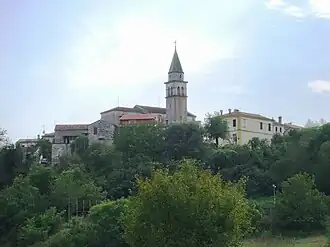 Im Zentrum des Ortes liegt der Hauptplatz mit der Martinskirche und dem Turm. Außerdem gibt es ein Denkmal für die Gefallenen im Zweiten Weltkrieg und einen Brunnen. An der Südseite des Platzes, von dem die Straßen strahlenförmig ablaufen, befindet sich das Geburtshaus von Vladimir Gortan,[3] in dem sich ein kleines Denkmal für diesen befindet.[4] Ein Gedenkbeinhaus Gortans liegt abseits des Ortes in Podberam auf der anderen Seite der Straße von Pazin nach Poreč.[3] Es wurde im Jahr 1951 errichtet.[4]