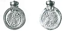 Bild 2 zeigt Gegenstände aus dem Grab Nr. 19, das sich außerhalb der Kirche an der südlichen Kirchenmauer befand. Mit 1 ist eine silberne Scheibenfibel mit eingepressten Kreuzzeichen, mit 2 bezeichnet sind bronzene Schnallen und Riemenzungen mit Silberblecheinlagen, die zu einer Schuhgarnitur gehörten.