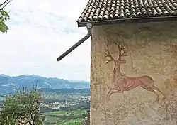 An der Außenwand im Norden wird das ältere Christophorus-Fresko von einer Darstellung der Kreuzigung Christi teilweise überdeckt. Die Szene über der Tür ist quadratisch und stellt neben Christus am Kreuz Maria und Johannes sowie zwei römische Soldaten mit Lanze und Essigschwamm dar. Die linke Wand wird von einem reitenden Jäger und einem springenden Hirsch eingenommen, der einzigen profanen Wandmalerei Tirols aus dieser Zeit. Im 16. Jahrhundert wurde die Szene übermalt und die Darstellung eines hl. Georg daraus gemacht; über die jagenden Hunde wurde ein Drachen gemalt. Als in späteren Jahrhunderten die Übermalung abbröckelte und die Hunde wieder zum Vorschein kamen, entstanden volkstümliche Deutungen des Bildes, die darin Dietrich von Bern, den Anführer der wilden Jagd sehen wollten, der zur Hölle fährt. Die außergewöhnliche Darstellung besitzt große künstlerische Qualität und Bedeutung.