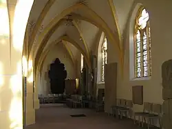 Der acht Meter breite und zwölf Meter hohe Chor, der den kleineren romanischen Vorgängerbau ersetzte, war der erste Bauabschnitt, der fertiggestellt wurde. Die Dachbalken aus Nadelhölzern[4] des Vorgängerbaus sind noch unter dem oberen Dach des neuen Chores vorhanden, deren Enden im noch vorhandenen romanischen Mauerwerk eingelassen sind, da der neue Bau aus Kostengründen einfach über dem alten errichtet wurde. Hinter dem Altar befinden sich drei Maßwerkfenster, ein weiteres ist in die südliche Chorwand eingelassen. Gut erkennbar sind die ursprünglichen romanischen Arkaden, die zu den Seitenkapellen geöffnet waren.[18] An der Nordseite des Chors ist eine Kapelle mit zwei Jochen und Kreuzrippengewölbe (ursprünglich die Nikolauskapelle) angebaut, deren Grundmauern schon vor dem Ausbau vorhanden waren; südlich wurde im 19. Jahrhundert an Stelle einer gotischen Seitenkapelle[18] die Sakristei angebaut.