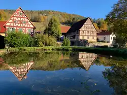 - ↑ Johann Kaspar Bundschuh: Geographisches Statistisch-Topographisches Lexikon von Franken oder vollständige alphabetische Beschreibung aller im ganzen Fränkischen Kreis liegenden Städte, Klöster, Schlösser, Dörfer, Flekken, Höfe, Berge, Thäler, Flüsse, Seen, merkwürdiger Gegenden u.s.w.: mit genauer Anzeige von deren Ursprung, ehemaligen und jetzigen Besitzern, Lage, Anzahl und Nahrung der Einwohner, Manufakturen, Fabriken, Viehstand, merkwürdigen Gebäuden, neuen Anstalten, vornehmsten Merkwürdigkeiten [et]c. [et]c. / 1. Stettin, Ulm 1799, Sp. 507–508 (bavarikon.de [abgerufen am 16. Juli 2022]).