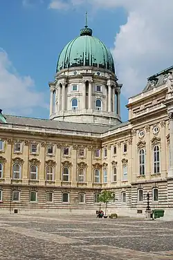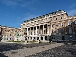 Ihre neubarocke Gestaltung erhielt die Budaer Burg in den Jahren 1891 bis 1905 durch König Franz Joseph I. von Architekt Alajos Hauszmann, der als Nachfolger des 1891 verstorbenen Hofbaumeisters Miklós Ybl diente. Im Zuge dieses Umbaus entstand im 300 Meter langen Donauflügel eine monumentale Raumfolge, bestehend aus Vorhalle, Großer Tanzsaal, Buffetgalerie, Habsburgersaal und Zeremoniensaal. Der rückwärtige Christinenstädter Flügel verfügte über eine weitere repräsentative Raumfolge, bestehend aus Vorhalle, Haupttreppe, Sankt-Stephan-Saal und König-Matthias-Saal. Zwischen beiden Flügeln lag die Burgkapelle. Gegenüber schlossen sich oberhalb das Hauptwachegebäude (Főőrség) und das Stallgebäude (Istállóépület) sowie unterhalb der Reitsaal (Lovarda) an.[3] Die Burg hatte sich nun zur Vierflügelanlage gewandelt.