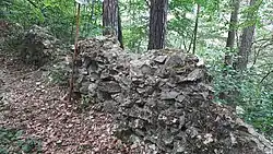 Von der einst großen Burganlage sind die Grundrisse überwachsen und lassen nur noch Reste der Wehrmauern und einen tiefen Graben sehen.