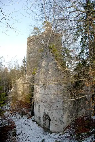 Der ehemals quadratische Bergfried (datiert aus der zweiten Hälfte des dreizehnten Jahrhunderts), dessen Ostteil abgebrochen ist, steht im Verband mit der äußeren Burgmauer; im ersten Turmobergeschoß ist westseitig ein spitzbogiges Eingangstor erhalten, ein Erkervorbau im vierten Geschoß ist an der Südseite erkennbar, des Weiteren Spitzbogenfenster.