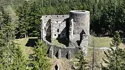 Rechts neben dem Tor steht rechts der mächtige, runde, romanische Bergfried, der die ganze Anlage dominiert. Das regelmäßige Bruchsteinmauerwerk lässt darauf schließen, dass er aus dem 13. Jahrhundert stammt. Da der Bergfried die Schwertarmseite eines möglichen gegen das Tor anstürmenden Angreifers bedrohte, war er nach damaligen Maßstäben richtig platziert. Er ist mit seinen etwa drei Meter dicken Mauern an der Basis über einem bis zu zwei Metern hohen geböschten Sockel errichtet, der die Geländeunebenheiten ausgleicht. Der Zugang zu dem acht Meter über dem Niveau des Hofes gelegenen Hocheinstieg erfolgte über eine Holzstiege von einer über dem Küchentrakt gelegenen Plattform aus. Auch wenn der Bergfried nur als letzte Rückzugsmöglichkeit gedacht war, so hatte er als Heizmöglichkeit einen Mantelkamin im Eingangsgeschoß.