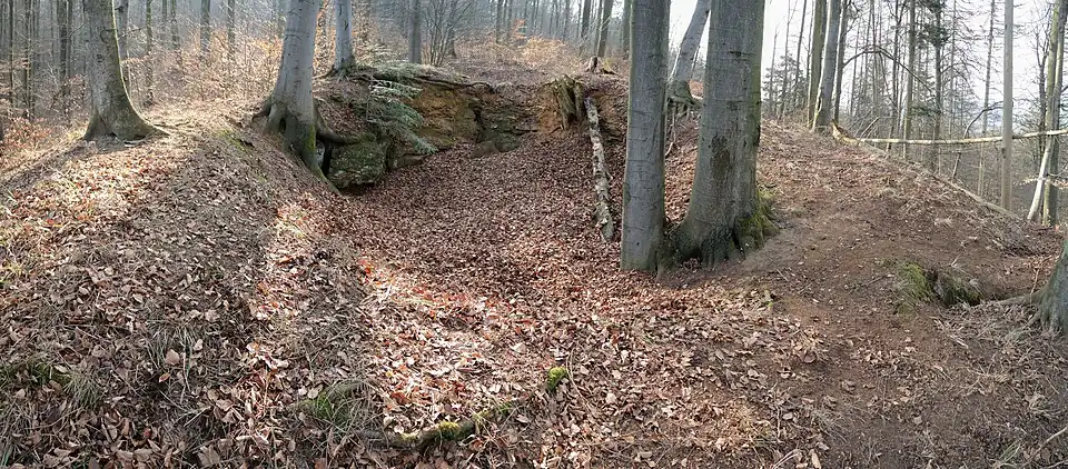 Die Vorburg lag an der dem Feind zugekehrten Angriffsseite und wurde durch einen leicht gebogenen, etwa 70 Meter langen Halsgraben vom weiter ansteigenden Berg abgetrennt. Dieser Graben ist heute noch etwa acht Meter tief und am Kamm 18 bis 20 Meter, an der Sohle noch etwa zehn Meter breit.[7] Er wurde aus dem hier anstehenden Dogger-Sandstein gehauen, wie noch an mehreren Stellen an senkrecht abgearbeiteten Flächen zu sehen ist. An beiden Enden des Grabens sind Abraumhügel gebildet worden, der südöstliche ist kaum noch wahrnehmbar, derjenige am Nordwestende dagegen ist sehr groß und bildet eine kleine Terrasse, die die Sohle des Grabens noch um etwa zehn Meter verlängert.