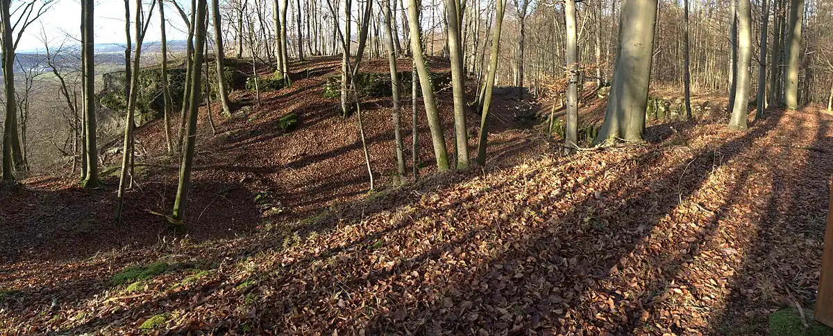 Der Graben liegt an der Nordostseite der fast kreisrunden Burgfläche. Die gegenüberliegenden Seiten waren durch den senkrechten Abfall der Felswand vor einem Angriff geschützt.