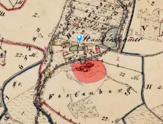 Staubershammer mit dem rot hinterlegten Burgstall Festenberg auf dem Urkataster von Bayern | ||