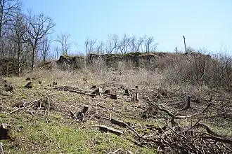 Die Ostseite geht dagegen fast eben in die Hochfläche über, so dass dort ein Graben angelegt werden musste. Dieser Abschnittsgraben (Bild 3) war etwa 35 Meter lang und 13,5 Meter breit. Sein äußerer Grabenrand zur Hochfläche liegt 1,9 bis 2,3 Meter über der Grabensohle, der innere liegt wesentlich höher, etwa 2,7 bis 3,8 Meter über der Sohle (Bild 4). Der Graben, von dem kein Abraumhügel erkennbar ist, verläuft in flachem Bogen um die Vorburg und läuft an beiden Enden, die jeweils leicht nach innen eingezogen sind, im Hang aus. Im nördlichen Bereich dieses Grabens sind noch 1,5 Meter lange Reste von Trockenmauerwerk erhalten.