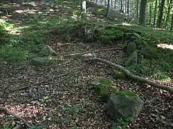 ![]() Burghügel (hangabwärts fotografiert) mit dem im Vordergrund erkennbaren bogenförmigen Halsgraben. | ||