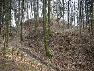Burgstall Walleshausen – Der Graben der südwestlichen Vorburg. Im Hintergrund der Turmhügel (September 2006) | ||