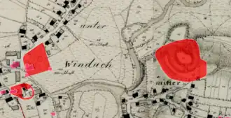 Lageplan von Burgstall Windach (rechts) und des Hofmarkschlosses Windach (links) auf dem Urkataster von Bayern | ||