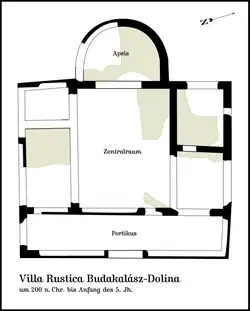 Im Kriegsjahr 1942 legte der Archäologe Tibor Nagy (1910–1995) im Dolina-Tal das Herrenhaus einer kleineren Villa rustica vom Portikus-Typ frei, deren regelmäßiger Grundriss in der zentralen Fluchtachse auf der Rückseite eine halbrunde Apsis aufwies. Nagy, der zur Grabung nur eine kurze Beschreibung herausgab, meinte, in der Apsisnische ein Bad zu erkennen, obwohl das Bodenniveau im Vergleich zum Fußboden der anderen Räume nicht viel niedriger ist. Fast alle Räume waren beheizbar, wobei das System der Hypokaust- und Kanalheizung gleichermaßen Verwendung fand. Der Ausgräber nahm an, dass die Villa rustica von Budakalász-Dolina am Ende des 2. oder zu Beginn des 3. Jahrhunderts entstanden ist. Kanalheizungen wurden im größeren Stil erst in der Spätantike gebräuchlich,[17] was Hinweise auf mögliche spätere Umbauten im Haus gibt. In den meisten Räumen fand sich über der Heizung ein Terrazzo-Fußbodenbelag.[18] An den Wänden des großen zentralen Raumes mit Apsis konnten noch Hohlziegel festgestellt werden, durch die einst vom Fußboden aufsteigende Wärme nach oben hin abgeleitet wurde. Das Ende des landwirtschaftlichen Betriebes wird im 5. Jahrhundert gekommen sein.