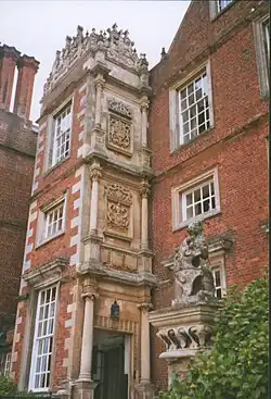 Die beiden rechteckigen Erker neben den beiden mittleren Teilungen des Hauses enthalten den Torbau und den Erker am Schirmende der Halle. So erhält man ein traditionelles Arrangement, aber mit dem Eingang zum Torbau an einer Stelle, die man nicht sieht, nicht von vorne, sondern auf der Seite des Erkers, sodass die Symmetrie in der Hauptansicht erhalten bleibt.