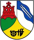 Blasonierung: „Geteilt in Silber (Weiß), über einer goldenen (gelben), eingebogenen Spitze, diese belegt mit einem schwarzen Pflug, vorn über einem grünen Dreiberg, wachsend, hinter einem roten, bezinnten Treppenaufgang, von zwei abgedeckten Seitentürmen flankiert, ein roter, hochstrebender gotischer, von drei offenen Rundbogenfenstern durchbrochener Backsteingiebel; hinten ein schrägrechter blauer Wellenbalken belegt mit einer silbernen (weißen) Zange.“