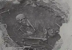 Harrington beschrieb die Gräber der „Rundgrabkultur“ und gab an, dass sie im Durchmesser eine Größe von zwei bis drei Fuß hatten. Die Leichname wurden gefaltet, sodass sie in diese Gräber passten. Typische Begräbnisbeigaben waren Ahlen aus Knochen, Specksteinschalen und Tierzähne. Die Gräber der Cherokee waren rechteckig und die Leichname wurden in einer gebeugten Position bestattet. Zu den typischen Grabbeigaben der Cherokee gehörten Lehmtöpfereien, Glasperlen und Pfeifen.[5]