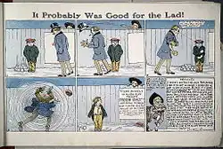 Der Vorname des Helden wurde wohl von Buster Keaton entlehnt, der damals schon ein Vaudeville-Kinderstar war. Der Zeitungscomic Buster Brown erschien das erste Mal am 4. Mai 1902 im New York Herald. Als Outcault 1906 zu den Hearst-Zeitungen wechselte, kam es zum Rechtsstreit zwischen dem Herald und Hearst. Das Gericht entschied, dass Outcault als Schöpfer zwar seinen erschaffenen Charakter mitnehmen konnte, dass der titelgebende Name aber beim Herald verbleiben musste. So erschien Buster Brown weiter beim Herald bis wahrscheinlich 1911, während Outcaults Version bei Hearst bis 1921 erschien.