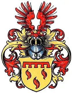 Blasonierung: In Gold drei (2:1) rote Flammen, darüber ein roter, fünflatziger Turnierkragen. Auf dem rot-golden bewulsteten Helm ein offener, roter Flug. Die Helmdecken sind rot-golden.[7]
