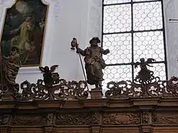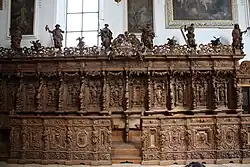 Auf die Dorsalwände und die niedrigeren Hochwangen ist das mit Ornamenten und Figuren geschmückte Gebälk aufgesetzt. Sein Gewicht wird hauptsächlich von Zugankern getragen, die in der Wand des Priesterchores befestigt sind.[30] Der untere Teil des Gebälks besteht aus drei Stufen. Darüber ist eine Frieszone angebracht, gefolgt von einem Kranzgesims. Beim Fries wechseln sich drei Ornamentformen ab, ein Draperietyp mit einem an zwei Seiten durch einen Knoten gerafften Tuch, ein Kartuschentyp mit Akanthusblättern und eine Variation eines Akanthusrankenornaments. Unter dem Gebälk sind zwischen den Hochwangen Girlanden aus Früchten, Blüten und Rankenwerk gespannt.