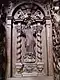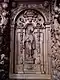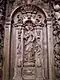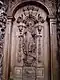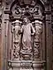 Der Eingang wird von Christus und Maria flankiert. Christus ist südlich des Portals, auf der Epistelseite, mit der Weltkugel in der linken Hand als Salvator mundi dargestellt. Seine Rechte ist zum Segnen ausgestreckt. Diese Stalle ist für den Prior bestimmt. Auf der Evangelienseite rafft Maria mit der Linken ihr überlanges Gewand etwas hoch, während die rechte Hand auf ihrer Brust ruht. Die Plätze neben Christus sind Elija und Paulus von Theben gewidmet. Der alttestamentliche Prophet Elija, der von den Karmeliten als ihr Ordensstifter verehrt wird, tritt mit seinem linken Fuß auf einen abgeschlagenen bärtigen Kopf. Dieses Attribut steht in Bezug zum Gottesurteil auf dem Karmel, als Elija nach seinem Sieg über die Propheten des Baal diese töten ließ (1 Kön 18,16–40 ). Der Platz des Paulus von Theben ist leer, seine Statue verloren gegangen, nur die Inschrift auf der Namenskartusche erinnert an ihn. Er war der erste Einsiedler und wurde zum Vorbild für die Pauliner. Die Statue von Johannes dem Täufer ist verschollen. Besondere Verehrung brachten ihm die Einsiedler vom heiligen Johannes entgegen, ein Orden, der 1575 von Papst Gregor XIII. bestätigt wurde. Der Name des Täufers auf der Kartusche zeigt an, dass er den Platz neben Maria innehatte, gefolgt von Antonius dem Großen, dem Vater des abendländischen Mönchtums, leicht zu erkennen am Antoniuskreuz auf seinem Umhang und dem Glöckchen in seinen Händen. Auf ihn berufen sich die Antoniter. Sie machten mit dem Läuten des Antoniusglöckchens bei Sammlungen für ihre Spitäler aufmerksam.[27]