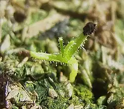 Die gelblich-grünen Blätter sind zwei bis vier Zentimeter lang, linear, im Querschnitt nierenförmig und enden in einer Verdickung an der Blattspitze. Auf der Oberfläche sind sie haarlos, an den Rändern und der Unterseite jedoch dicht besetzt mit gestielten Drüsen, die eine klebrige Flüssigkeit absondern.