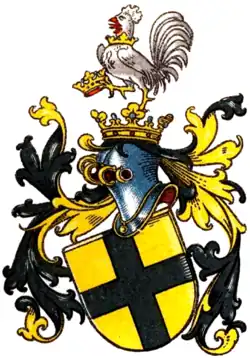 Das Stammwappen zeigt in Gold ein durchgehendes schwarzes Kreuz. Auf dem Helm ein (schwarz-gestulpter, goldener Hut, darauf) ein schwarzer (oder silberner) Hahn mit rotem Kamm und Lappen. Die Helmdecken sind schwarz-golden.