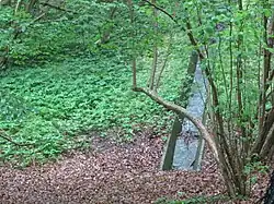 - ↑ Der ungefähre Bachverlauf mit dem Stausee ist auf verschiedenen Karten eingetragen; Vgl. beispielsweise: Falk-Verlag Stadtplan Extra Standardfaltung, Flensburg + Umgebung, 7. Auflage 2014 sowie Graphischen Institutes Eckmann (mediaprint): Stadtplan Flensburg mit Harrislee und Glücksburg (Zentrum) vom, Stand 2011