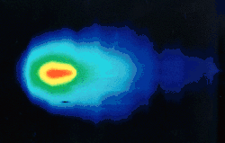 - Auf fotografischen Aufnahmen des Kometen waren mehrere fächerförmige Strahlen in jeweils veränderter Anordnung zu erkennen. Sekanina konnte zeigen, dass es sich um ausströmendes Gas und Staub aus mindestens drei diskreten Ausbruchsschloten handelte.