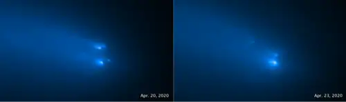 Die Helligkeit, die gegen Ende März schon unter 8 mag lag, steigerte sich von da ab aber überraschenderweise nicht weiter, sondern ging wieder langsam zurück. Zugleich konnte am 6. April gemeldet werden, dass der Komet sein Aussehen verändert hatte und möglicherweise dabei war zu zerbrechen.[3] Dies bestätigte sich in den folgenden Tagen und im April wurde beobachtet, dass der Kometenkern bereits in über 20 größere und kleinere Teile zerfallen war, die sich voneinander entfernten. Die vier größten davon erhielten die Bezeichnungen C/2019 Y4-A bis -D und konnten jeweils noch einige Tage bis Wochen weiter verfolgt werden, bevor sie sich völlig in diffuse Staubwolken auflösten. Die letzten Beobachtungen erfolgten am 16. Mai 2020.