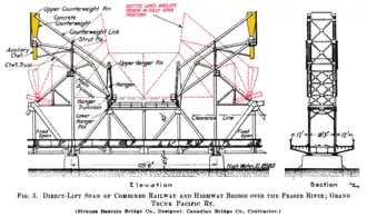 Der von Joseph Baermann Strauss entworfene Hubbrückentyp (direct lift) ist eine seltene Bauform, die im Gegensatz zur üblichen Konstruktion ohne Seilzugsystem auskommt; die Hubhöhe ist dafür aber eingeschränkt. Die Bewegung des Brückenträgers geschieht wie bei der Strauss-Klappbrücke ausschließlich über Hebelarme, wobei die Gegengewichte über ein bewegliches Rahmengestell in Form eines Parallelogramms mit dem Brückenträger verbunden sind. Der jeweilige Drehzapfen (engl. trunnion) befindet sich in der Mitte der unteren Seite des Parallelogramms und durch die Beweglichkeit des Rahmengestells ist eine rein vertikale Bewegung des Brückenträgers möglich. Angetrieben wurde der Hubmechanismus über einen Elektromotor,[10] der unterhalb der Gleisebene im beweglichen Brückenträger positioniert ist und über ein Getriebe und Gestänge vier Stirnräder an den Enden des Trägers antreibt. An den Innenseiten der senkrechten Ständer auf den Brückenpfeilern, die das Rahmengestell tragen, sind an den Innenseiten Zahnstangen angebracht, in die die Stirnräder eingreifen und so die Hebung und Senkung des ausbalancierten Systems aus Brückenträger und Gegengewichten mit wenig Kraftaufwand ermöglichten. Die Stahlkonstruktion wiegt 580 t,[8] die Spannweite beträgt hier 30,5 m und die Hubhöhe 12,2 m.[4][11]