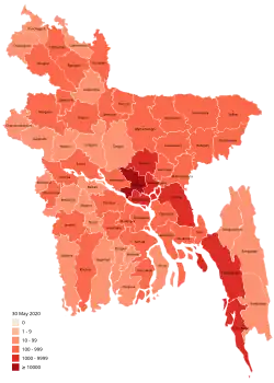 Am 8. März 2020 wurden die ersten COVID-19-Fälle in Bangladesch bestätigt. Es handelte sich um zwei Personen, die aus Italien zurückgekehrt waren, sowie eine Familienangehörige.[4] In den WHO-Situationsberichten tauchten diese Fälle erstmals am 9. März 2020 auf.[5] Am 20. März 2020 wurde im Distrikt Madaripur die erste Ausgangssperre in Zusammenhang mit der Pandemie verhängt.[6]
