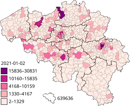 Anfang September 2020 gab es in Belgien 26 Gemeinden mit mehr als 100 Neuinfektionen pro 100.000 Einwohner: alle Gemeinden der Region Brüssel-Hauptstadt, fünf nördlich dieser Region gelegene Gemeinden im Arrondissement Halle-Vilvoorde sowie die Stadt Antwerpen und die östlich an sie grenzende Gemeinde Borsbeek. Diesen Gemeinden wurde am 4. September 2020 auferlegt, eigene Krisenzentren zu bilden, die auch örtliche Maßnahmen anordnen dürfen.[18]