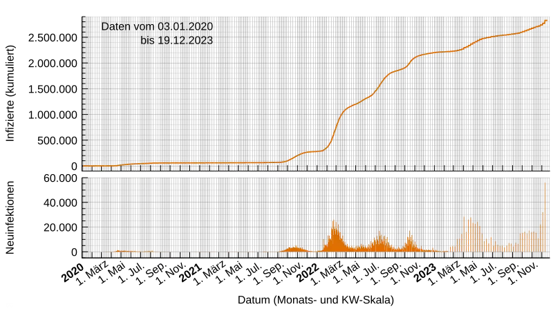 - ↑ a b WHO Coronavirus Disease (COVID-19) Dashboard; oben rechts auf der Seite ist ein Link zum Download der Daten im CSV-Format